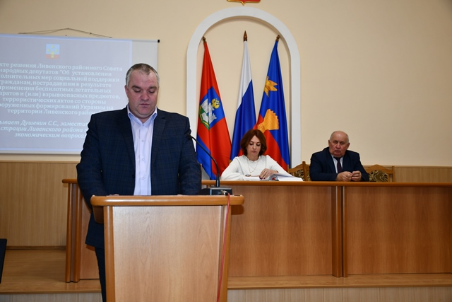 Депутаты рассмотрели и единогласным решением установили дополнительные меры социальной поддержки гражданам, пострадавшим в результате применения беспилотных летательных аппаратов и (или) взрывоопасных предметов, террористических актов со стороны вооруженных формирований Украины на территории Ливенского района.