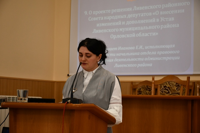 Следующим были рассмотрены и приняты изменения в Устав Ливенского района. Документ уточнялся в связи с произошедшими в законодательстве изменениями.