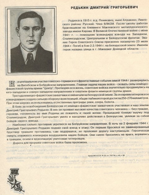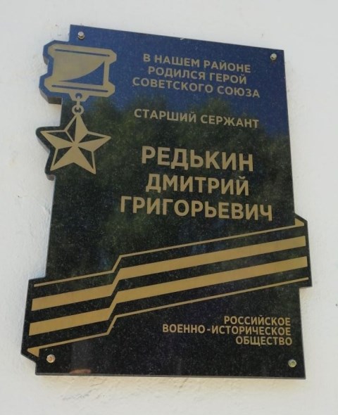 Мемориальная доска с именем Героя Советского Союза Редькина Дмитрия Григорьевича