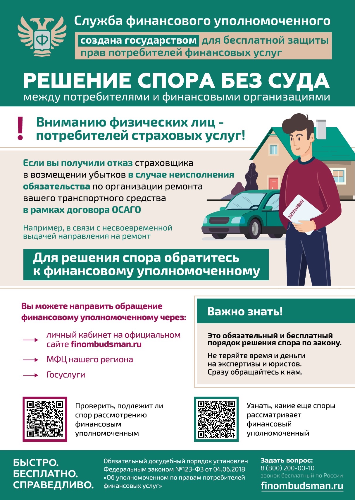 Напоминаем, что Служба финансового уполномоченного создана государством для бесплатной защиты прав потребителей финансовых услуг. Потребители финансовых услуг могут разрешить имущественные (денежные) споры со страховыми компаниями, банками, микрофинансовыми организациями, КПК, НПФами и ломбардами в досудебном порядке. Данный порядок является обязательным в силу Федерального закона "Об уполномоченном по правам потребителей финансовый услуг".
