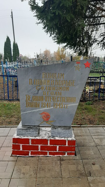 Могила находится на южной окраине села. Надгробие представляет собой скульптуру скорбящего воина, установленную на постаменте. облицованном красным кирпичом. Справа установлена стела, на которой закреплены мемориальные плиты с именами односельчан, погибших в годы ВОВ. Всего захороненных - 39, из них известных - 1, неизвестных - 38.
