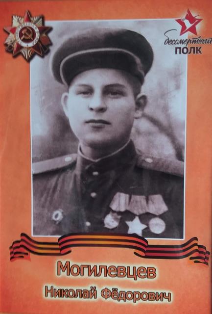 Могилевцев Николай Федорович родился 23.08.1924 года в д. Калиновка. Был призван в армию 22 февраля 1942 года. С 02.1942 г. – 05.1942 г. – курсант, 05.1942 г. – 08.1943 г. – командир стрелкового отделения, 08.1943 г. – 08.1946 г. командир отделения артиллерийской разведки, 08.1946 г. – 02.1947 г. – командир отделения артиллерийской разведки. Награжден орденом Славы третьей степени, орденом Красной Звезды, орденом Красного Знамени и медалью "За отвагу".