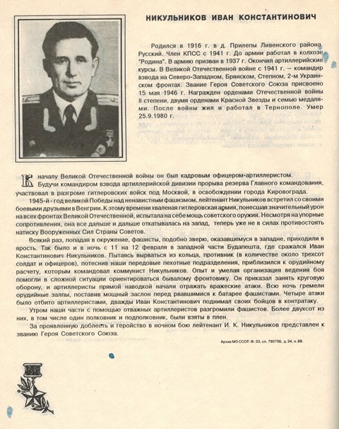 Мемориальная доска с именем Героя Советского Союза Никульникова Ивана Константиновича