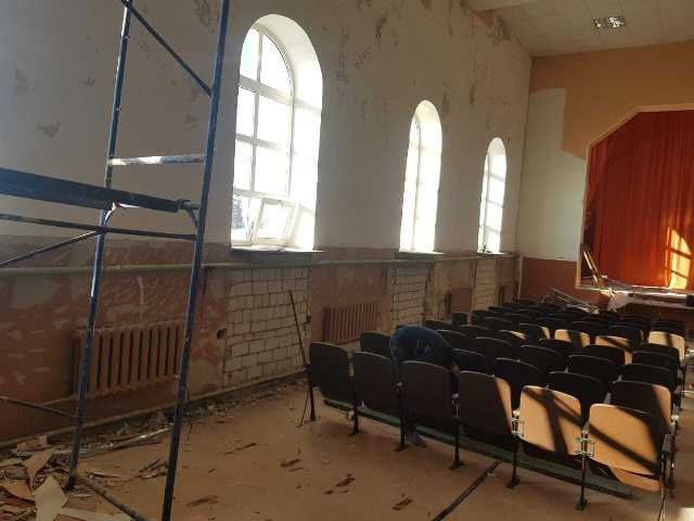 Подрядчиком работы начаты 9 марта. Проведен демонтаж кровли, отопления, внутренних помещений. Проведено оштукатуривание фойе и зрительного зала.