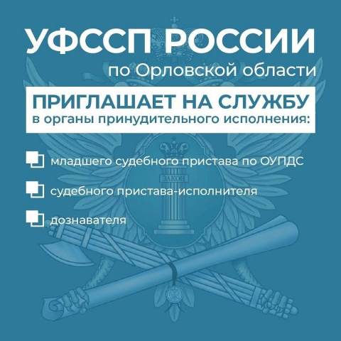 Управление Федеральной службы судебных приставов по Орловской области продолжает прием на службу в органы принудительного исполнения Российской Федерации на должности: судебного пристава-исполнителя, младшего судебного пристава по обеспечению установленного порядка деятельности судов, дознавателя. На службу приглашаются граждане Российской Федерации в возрасте от 18 до 40 лет.
