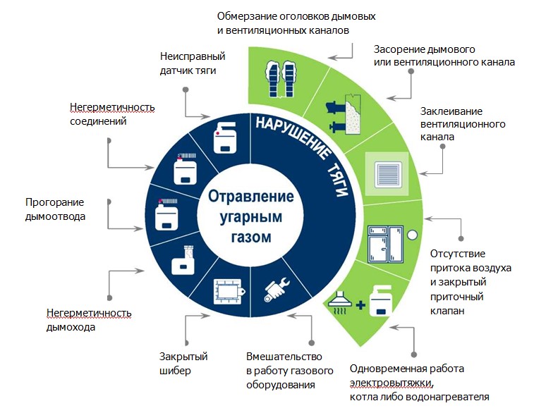 Отсутствие тяги в дымоходе или вентиляционном канале, закрытый шибер печи, нарушение правил эксплуатации бытового газоиспользующего оборудования – это наиболее частые причины происшествий в жилом фонде, связанных с газом.
