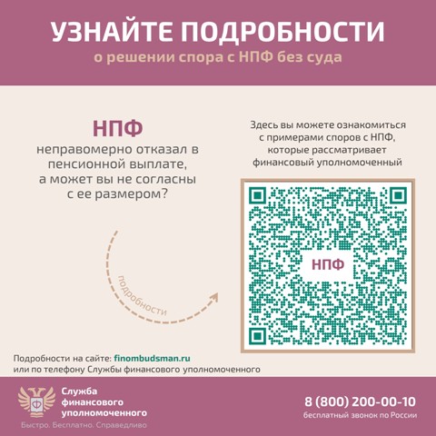 Финансовый уполномоченный по Закону* поможет вам абсолютно бесплатно, если НПФ отказался удовлетворить ваши требования по пенсионным выплатам, возникшие в рамках договоров об обязательном пенсионном страховании (ОПС), негосударственного пенсионного обеспечения (НПО), досрочного негосударственного пенсионного обеспечения (ДНПО), например, если вы не согласны: