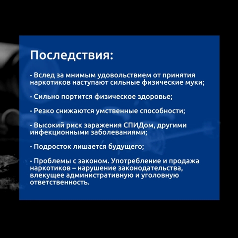 Наркотики — это путь в никуда. Они разрушают здоровье, ломают судьбы, отнимают мечты и близких людей. За коротким удовольствием скрываются страшные последствия: зависимость, болезни, потеря себя.